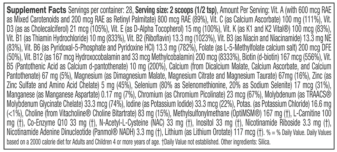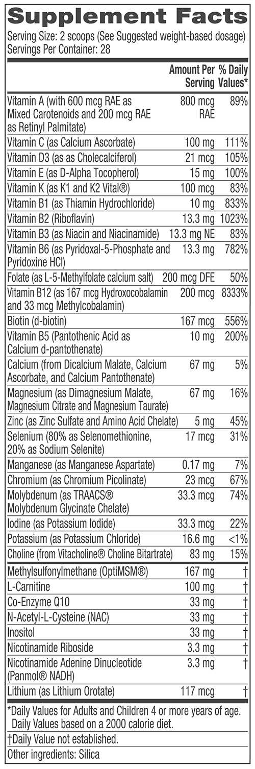 Our broad spectrum multiple vitamin/mineral supplement contains 30+ highly bioavailable essential nutrients formulated to address nutritional imbalances and deficiencies commonly observed in children and adults on the spectrum.**